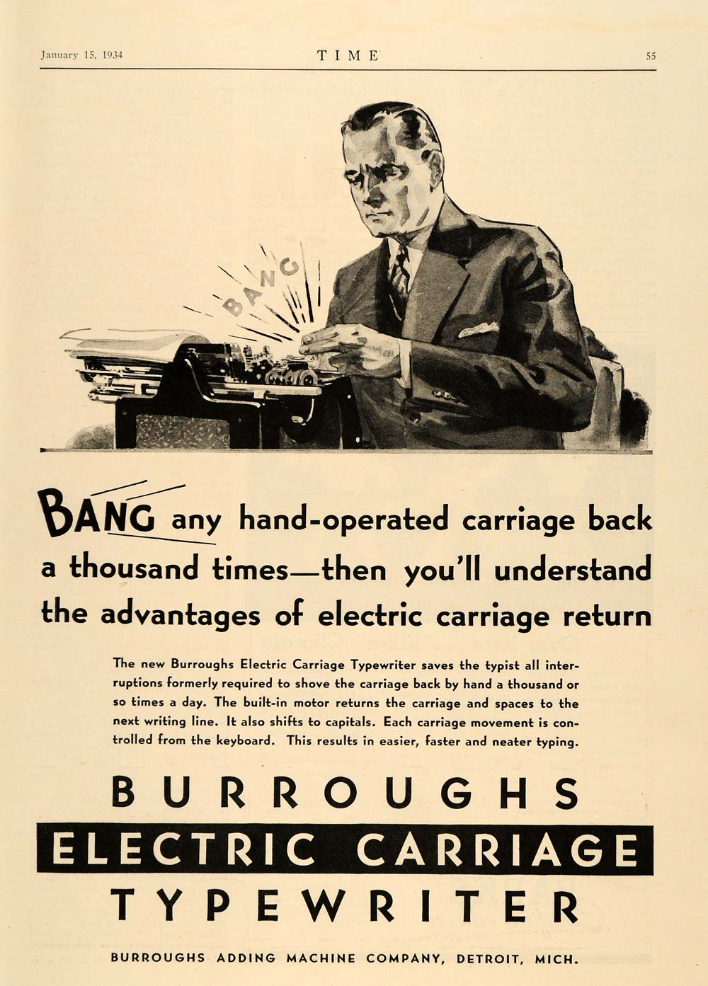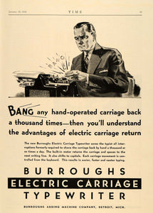 This is an original 1934 black and white print ad for the Burroughs Adding Machine Company of Detroit, Michigan. The ad writes, "Bang any hand-operated carriage back a thousand times-- then you'll understand the advantages of electric carriage return..."
