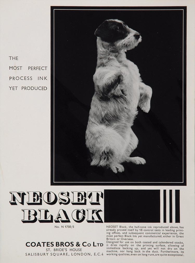 This is an original 1934 ad for Neoset Black printing ink, no. 1750/5 from Coates Bros. & Co., Ltd., St. Bride's House, Salisbury Square, London. Very nice illustration of a dog.