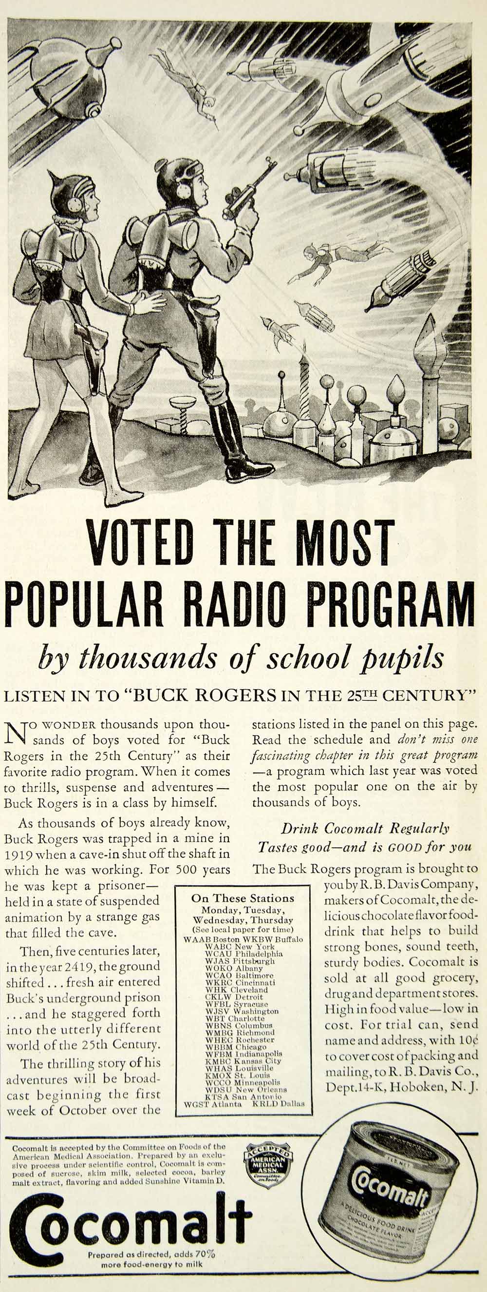 Keywords specific to this image: Vintage Advertising, Drink, Liquid, Grocery, Pantry, Meal, Eat, Tin Can, Label, Packaging, American Medical Association, AMA, Diet, Nutrition, Breakfast, Cocoa, Vitamin D, Radio Program, Show, Entertainment, Broadcast, Station, 25th Century, Sci-Fi, Science Fiction, Futuristic, Costume, Jet Pack, Technology, Rocket, Spaceship, Spacecraft, Laser Gun, Pistol, Weapon, City, Urban, Outer Space, Galaxy, Universe, Planet, Company, New Jersey, Milk, Art