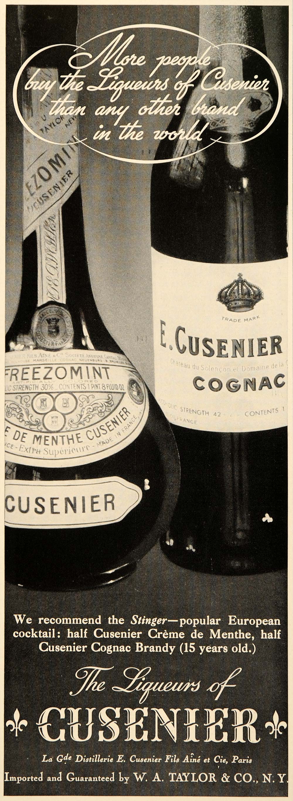 This is an original 1934 black and white print ad for the Cusenier Cognac Brandy liquor from W. A. Taylor & Company located in New York.