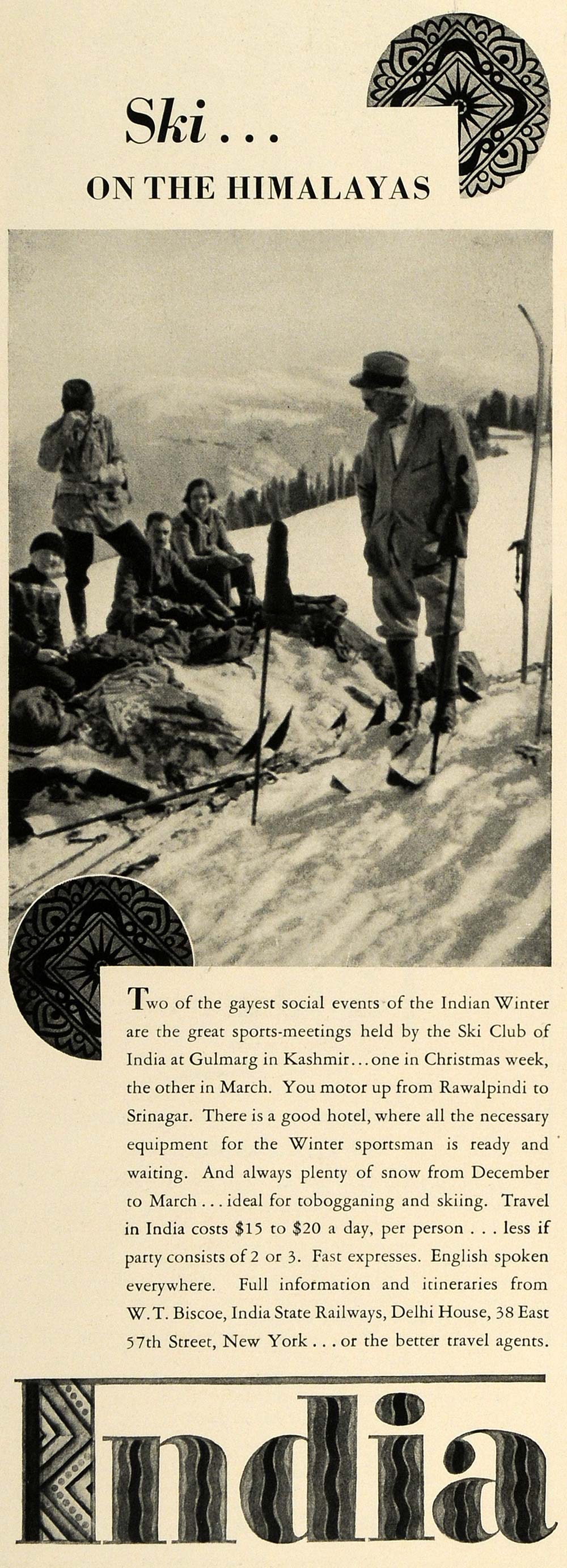 This is an original 1934 black and white print ad for the Delhi House and the India State Railway of 38 East 57th Street in New York; this ad features their travel to India and the great skiing available on the Himalayan Mountains.