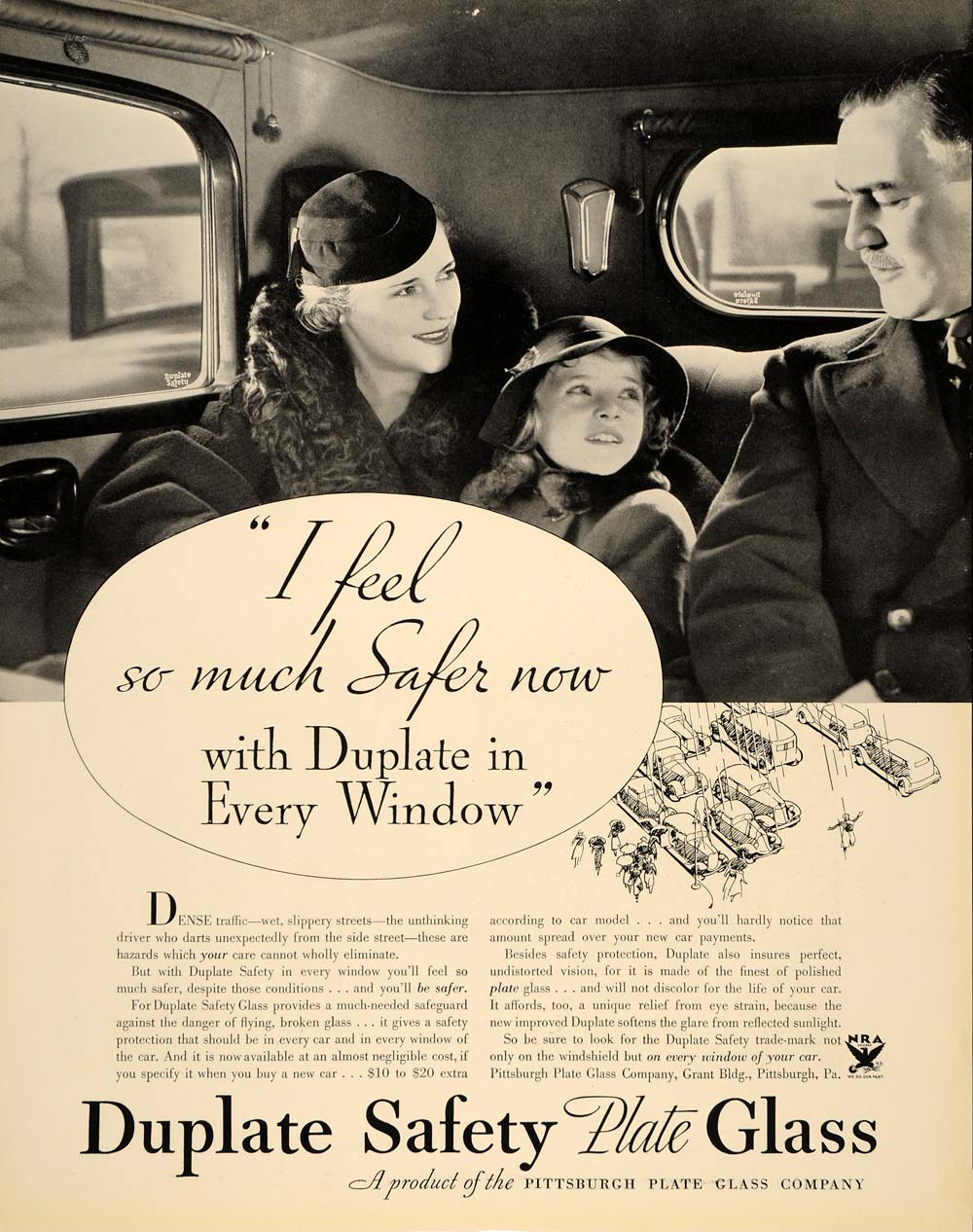 This is an original 1934 Great Depression Era black and white print ad for Duplate Safety Plate Glass.