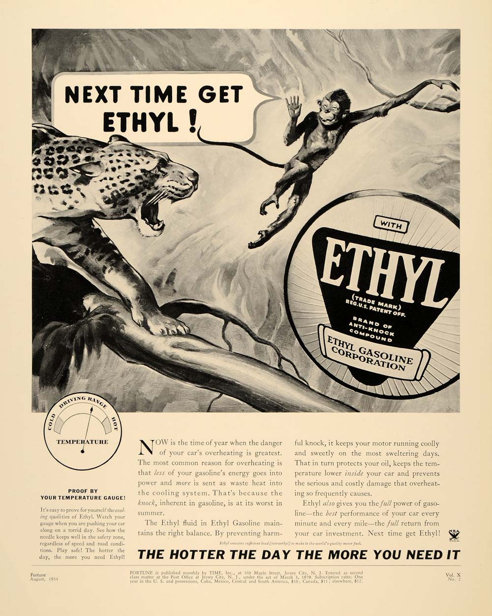Keywords specific to this image: Car Enthusiasts, Car Products, Overheating Automobiles, Oil, Lubrication, Jungle Cats, Monkey, Temperature Gauge Vintage Advertising
