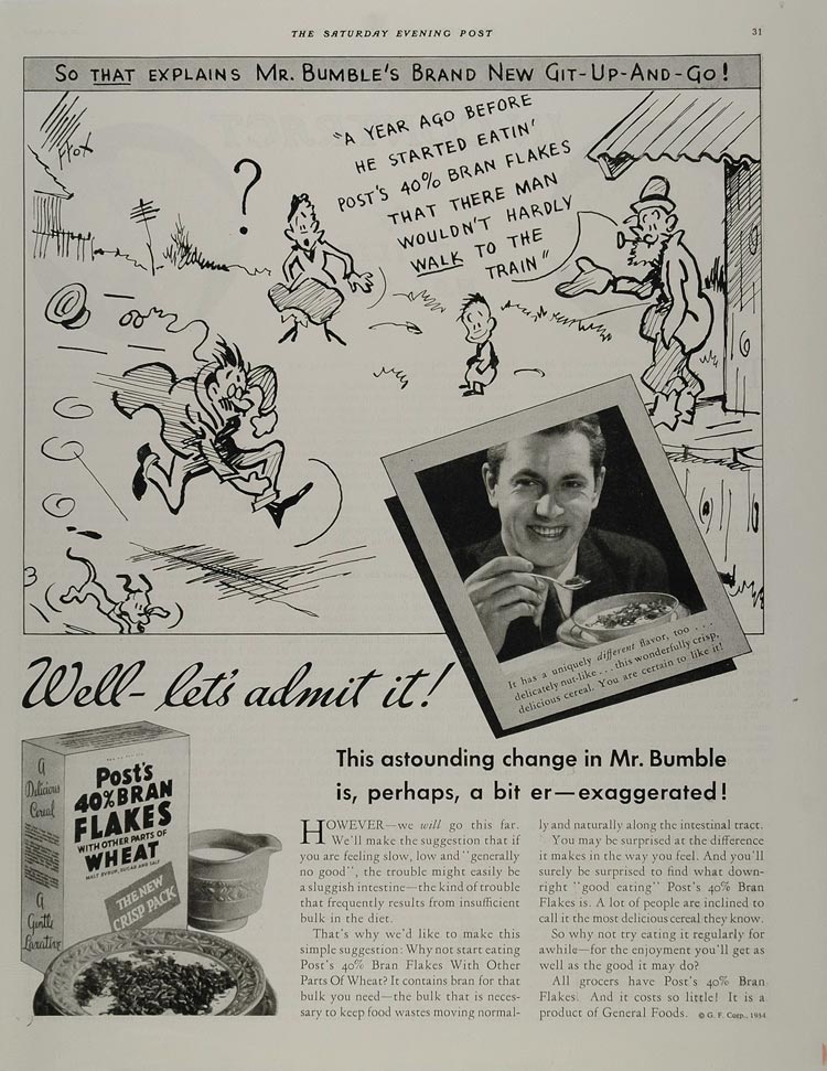 This is an original 1934 black and white print ad for Post's 40% Bran Flakes Cereal with a halftone print of cartoonist F. Fox enjoying a bowl of Post's 40% Bran Flakes.