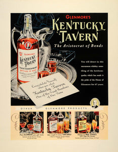 This is an original 1934 color print ad for Glenmore Distilleries Company's Kentucky Tavern Straight Bourbon Whiskey; it's "the Aristocrat of Bonds". This ad features other Glenmore products: Kentucky Straight Bourbon Whiskey, the Tom Hardy blend of Kentucky Straight Whiskeys, and the 90-proof Kentucky Straight Bourbon Whiskey called Mint Springs.