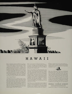 This is an original 1934 black and white print ad for travel to Hawaii from the Hawaii Tourist Bureau with a great illustration of the statue of Kamehameha, the Great in Honolulu.