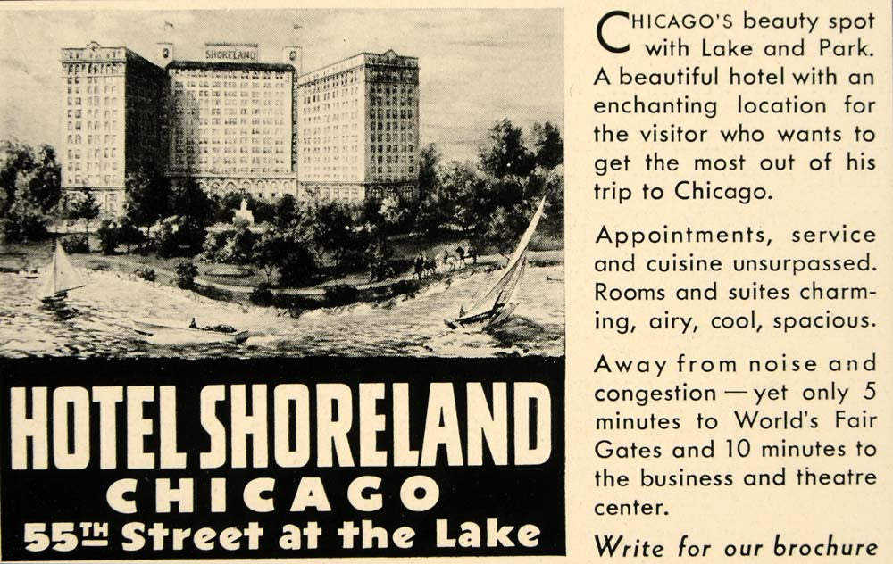 This is an original 1934 black and white print ad for Hotel Shoreland located on 55th Street in Chicago, Illinois. It is located on the shores of Lake Michigan.