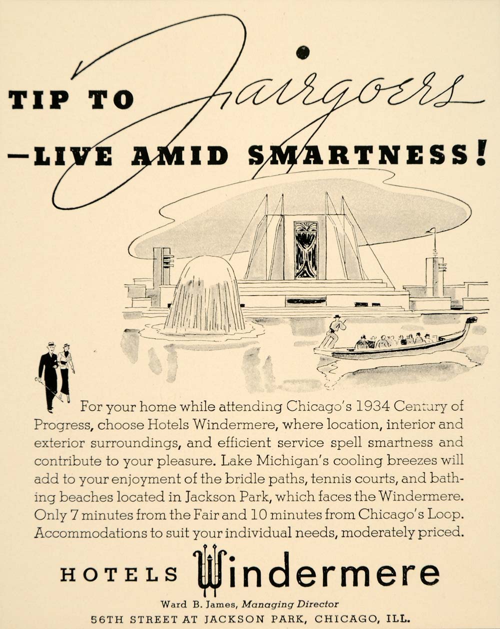 This is an original 1934 black and white print ad for Hotels Windermere located on 56th Street at Jackson Park in Chicago, Illinois. Ward B. James was Managing Director of the hotel.