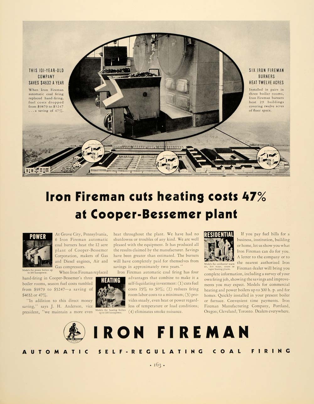 This is an original 1934 black and white print ad for Iron Fireman heating boiler from Iron Fireman Manufacturing Company.
