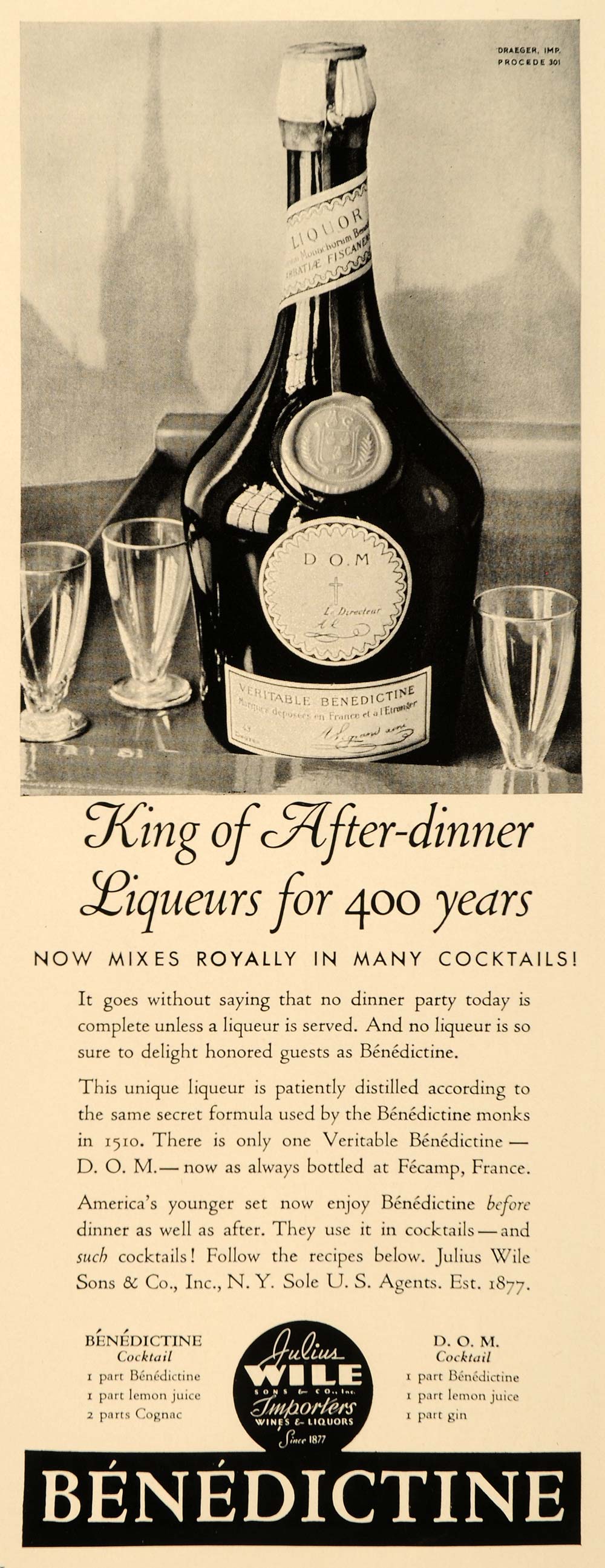 This is an original 1934 Great Depression Era black and white print ad for Veritable Benedictine D.O.M. Liqueurs.