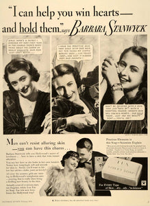 This is an original 1934 black and white print ad for Lux Toilet Soap, featuring American Actress Babara Stanwyck who, throughout her career, has won three Emmy Awards, a Golden Globe, has a star on the Hollywood Walk of Fame, was a recepient of honorary lifetime awards from the Film Society of Linocln Center, the Golden Globes, the Los Angeles Film Critics Association, the Motion Picture Academy and the Screen Actors Guild. Stanwyk was also ranked 11th by the American Film Institution as the greatest female star of all time.