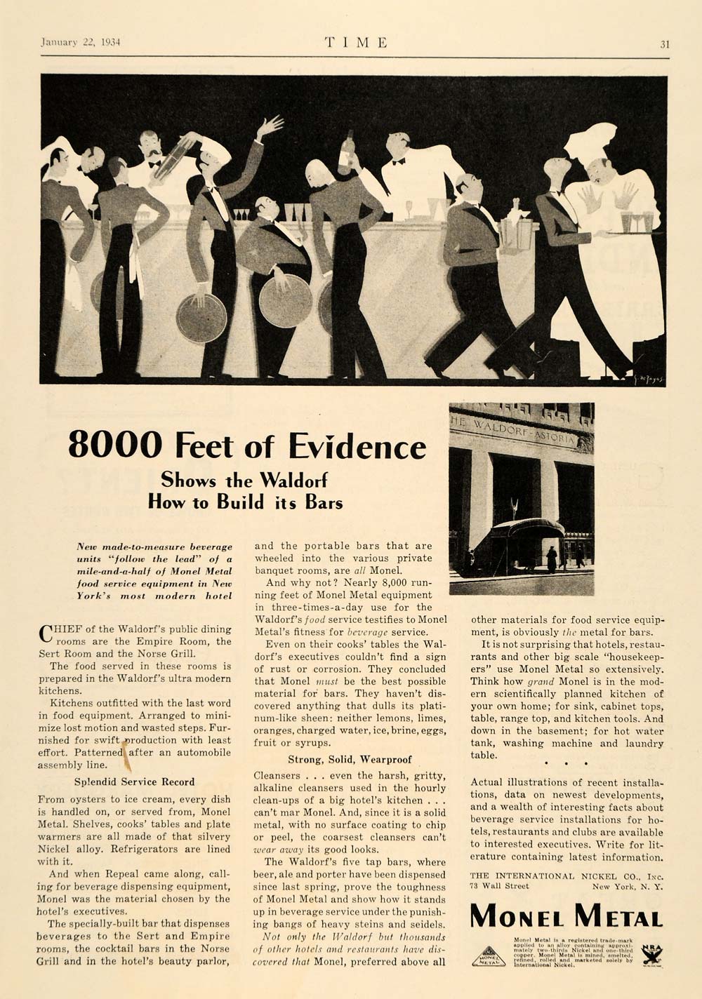This is an original 1934 black and white print ad for Monel Metal from The International Nickel Company of New York. The ad features an image of chefs and waiters from the Waldorf-Astoria Hotel stacking their platters with drinks.