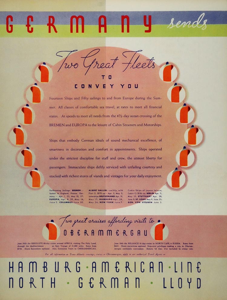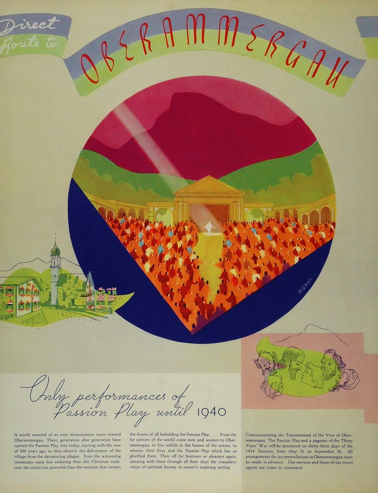 This is an original 1934 two page color print ad from the Hamburg American Line and North German Lloyd for cruises to the Passion Play performance celebrating the Tercentennial of the Vow of Oberammergau in Oberammergau, Germany.