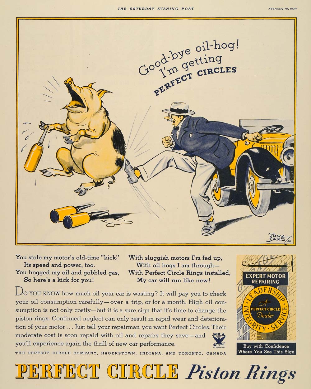This is an original 1934 color print ad for Perfect Circle Piston Rings by The Perfect Circle Company located in Hagerstown, Indiana and Toronto, Canada.