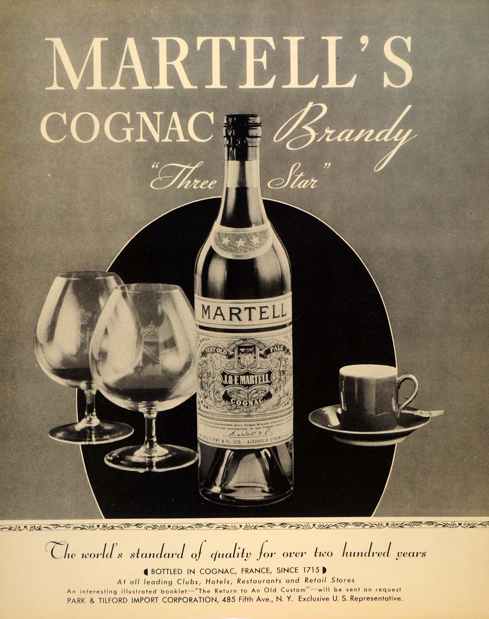 This is an original 1934 black and white print ad for Martell's Cognac Brandy from Park & Tilford Import Corporation located at 485 Fifth Avenue, New York.