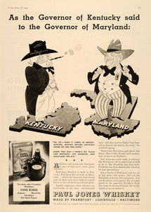 This is an original 1934 black and white print ad for Paul Jones Whiskey. THe ad features an image of a man standing on the state of Kentucky, and one of the state of Maryland.