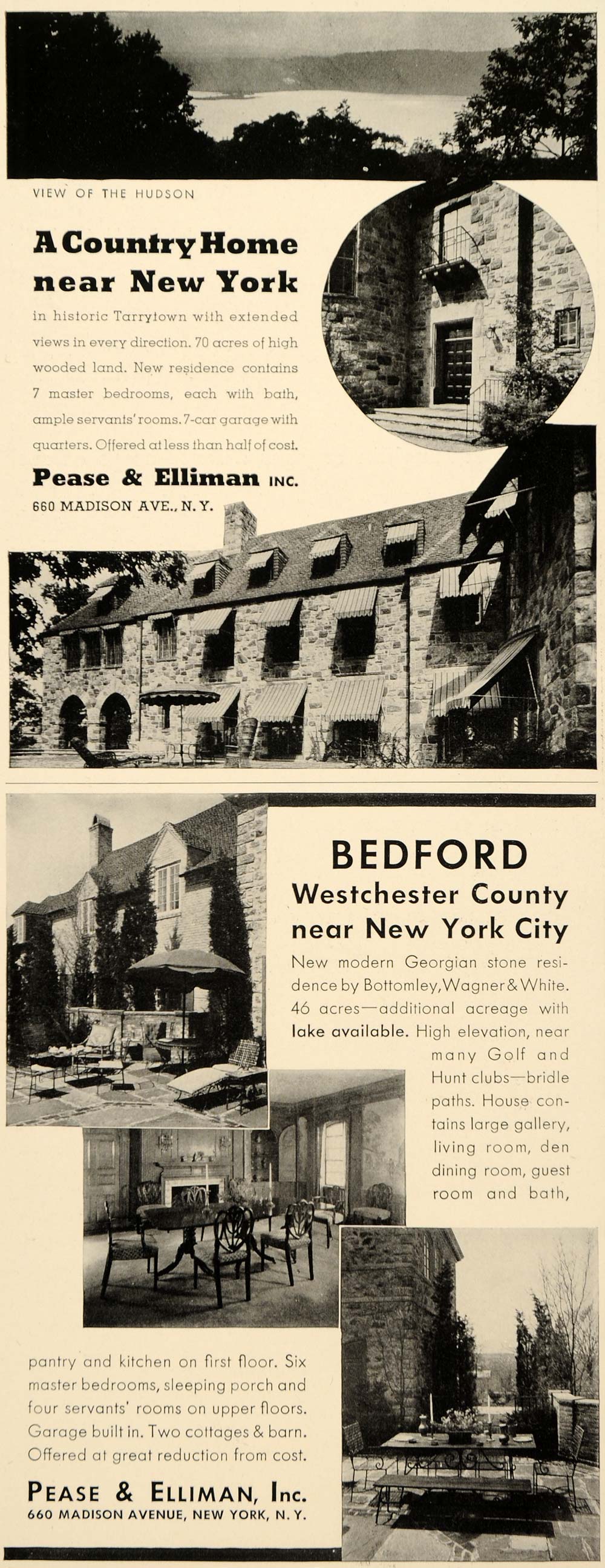 This is an original 1934 black and white print ad for the Pease & Elliman, Incorporation located at 660 Madison Avenue, New York. In the ad is a veiw of the Hudson river.