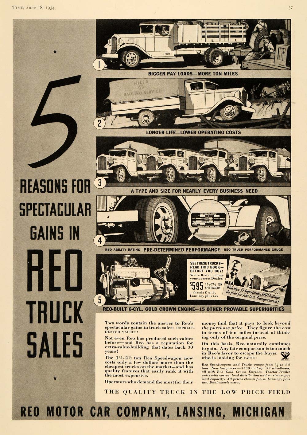 This is an original 1934 black and white print ad for the Reo Motor Car Company of Lansing, Michigan.