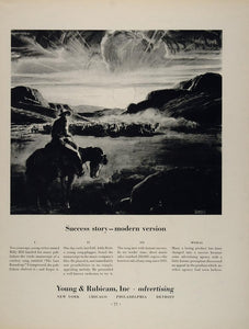 This is an original 1934 print ad for Young & Rubicam, Inc., Advertising which tells the success story of a song "The Last Round-Up" by a young songwriter named Billy Hill. After first being shelved, the song was picked up by song-plugger, Addy Britt, who persuaded a well-known orchestra to try it which resulted in a great success. Great illustration of the American West!
