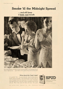 This is an original 1934 black and white print ad for Spud Menthol-Cooled Cigarettes. The ad writes, "Is it menthol? Yes... but only indirectly. Spud's smoke contains hardly a trace of menthol..."