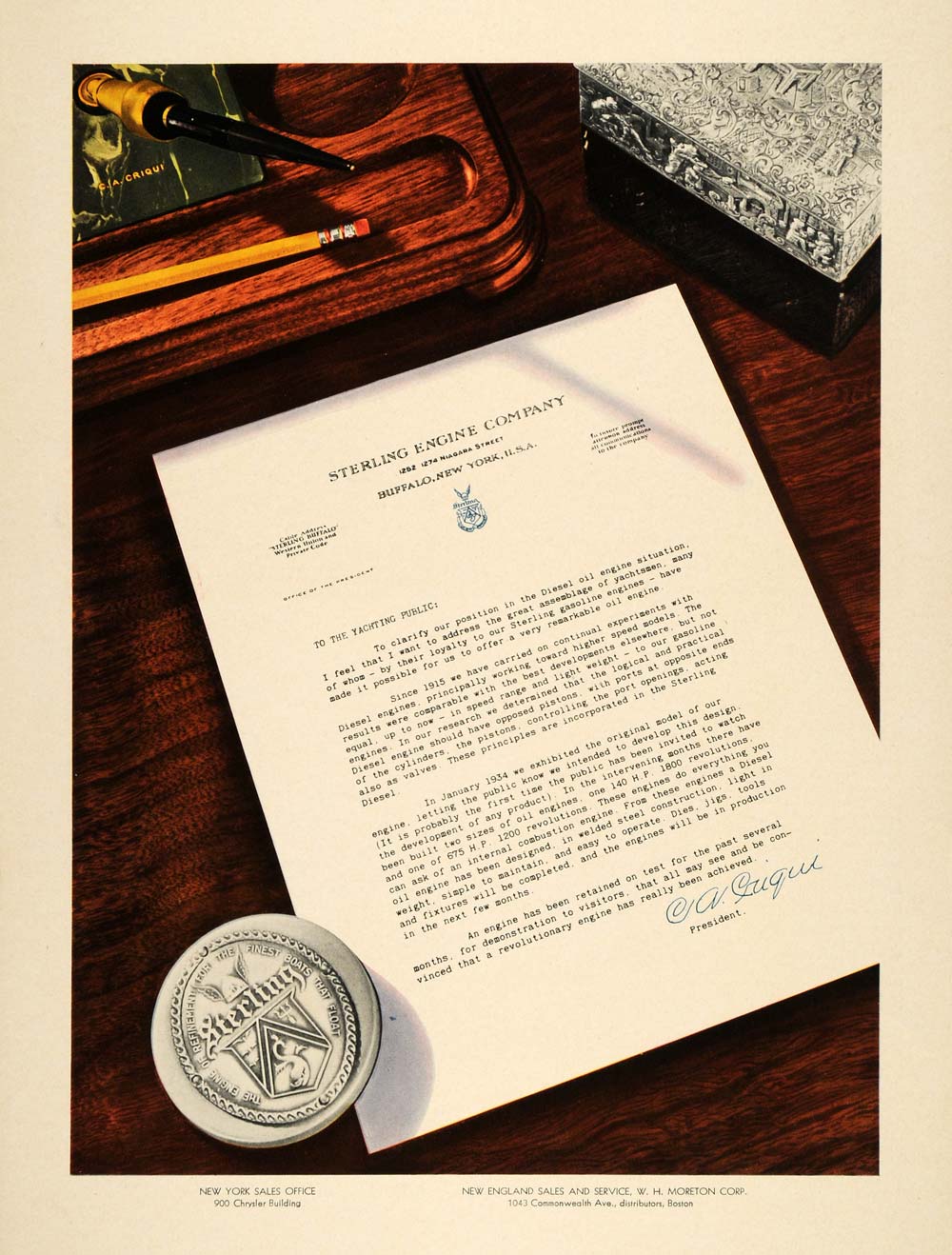 This is an original 1934 color print ad promoting the Diesel Oil Engine from the Sterling Engine Company located at 1250-1270 Niagara Street, Buffalo, New York.