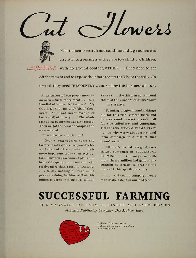 This is an original 1934 2 page color print ad promoting advertising in Successful Farming: The Magazine of Farm Business and Farm Homes from the Meredith Publishing Company, Des Moines, Iowa. The second page is a stunning illustration by Charleson which would look beautiful framed.