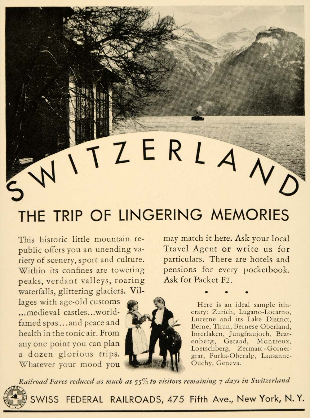 This is an original 1934 black and white print ad for Swiss Federal Railroads located at 475 Fifth Ave., New York. The ad is promoting travel in Switzerland.