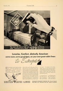 This is an original 1934 black and white print ad for travel to Europe on the great cabin liners of the United States Lines.