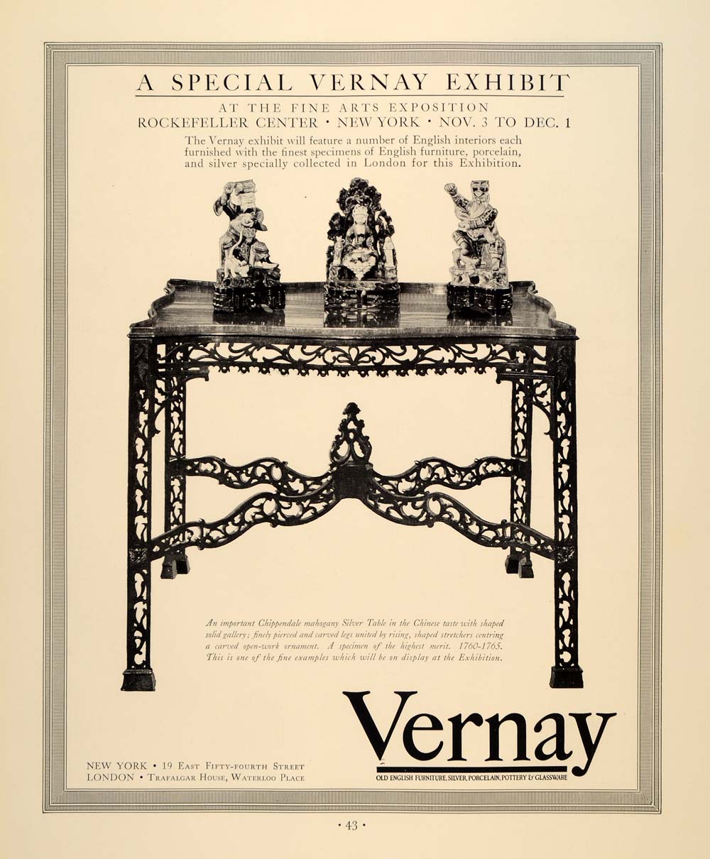 Keywords specific to this image: furnishing, pottery, glassware, old furniture, vintage decor, Chinese Chippendale mahogany silver table, ornaments, New York, London, old collection, old home decoration Vintage Advertising