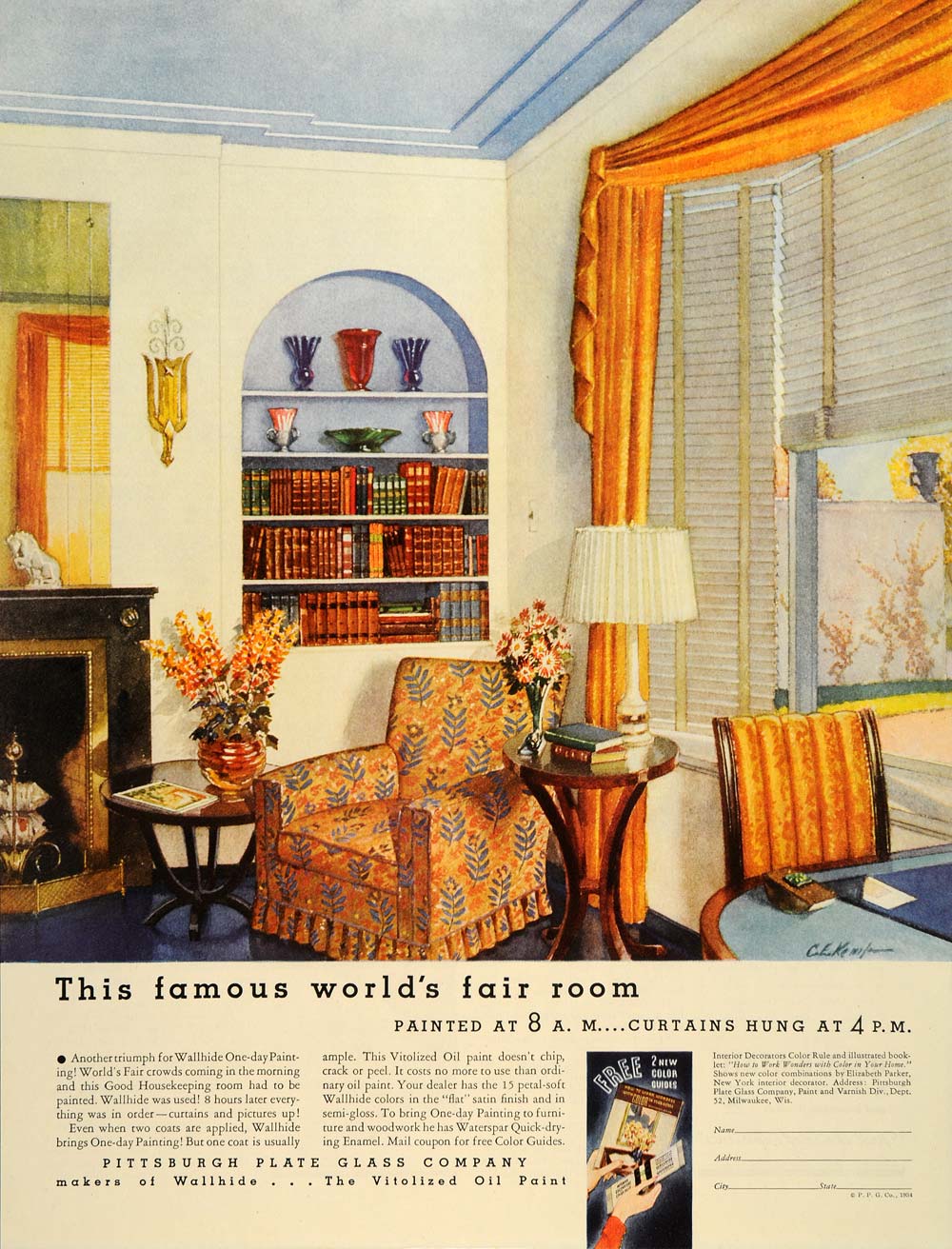 This is an original 1934 color print ad for Wallhide paint. The ad shows an image of a world's fair room.