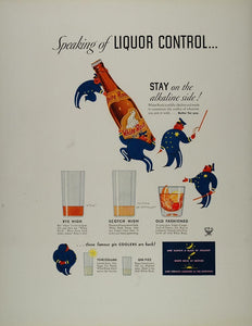 This is an original 1934 color print ad for White Rock Water--an alkaline mixer for the various cocktail drinks illustrated here: Rye High, Scotch High, Old Fashioned, Tom Collins, and Gin Fizz.
