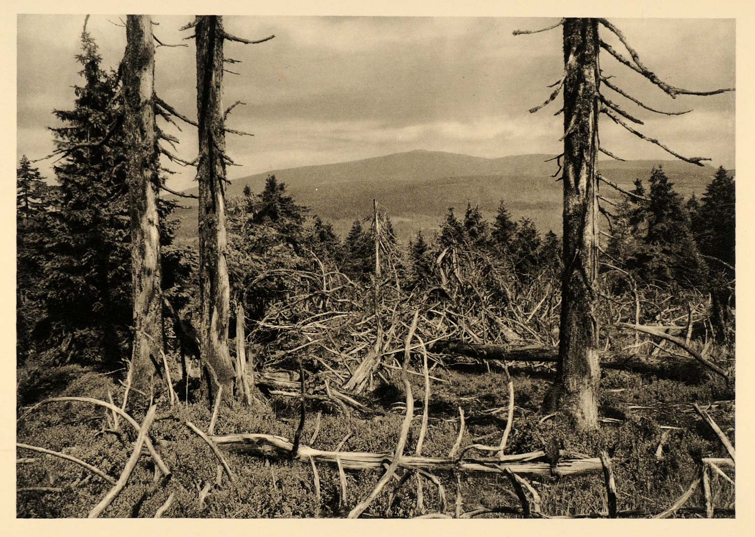 This is an original 1934 photogravure of the Brocken-- the highest peak in Germany, located near Schierke in the Harz Mountains. Interestingly, this peak has been associated with witchcraft, and has been used several times in literary works, such as Goethe's "Faust". The photographer of this image is unknown.