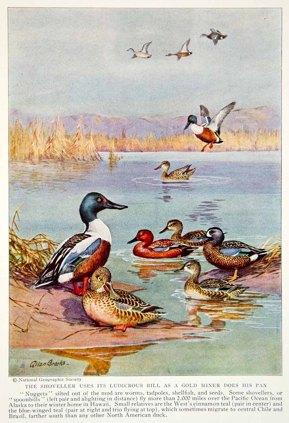 This is an original 1934 color print of several types of Shoveller birds, including the Spoonbill, the Cinnamon Teal, and the Blue Winged Teal.