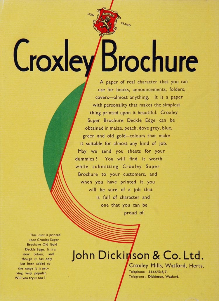 This is an original 1934 ad from John Dickinson & Co., Ltd, Croxley Mills, Watford, Herts. for Croxley Brochure paper. This is a nice graphic design and it is printed on Croxley Super Brochure Old Gold Deckle Edge paper. (Please note that the Deckle Edge on the right margin is not visible on the digital image.)