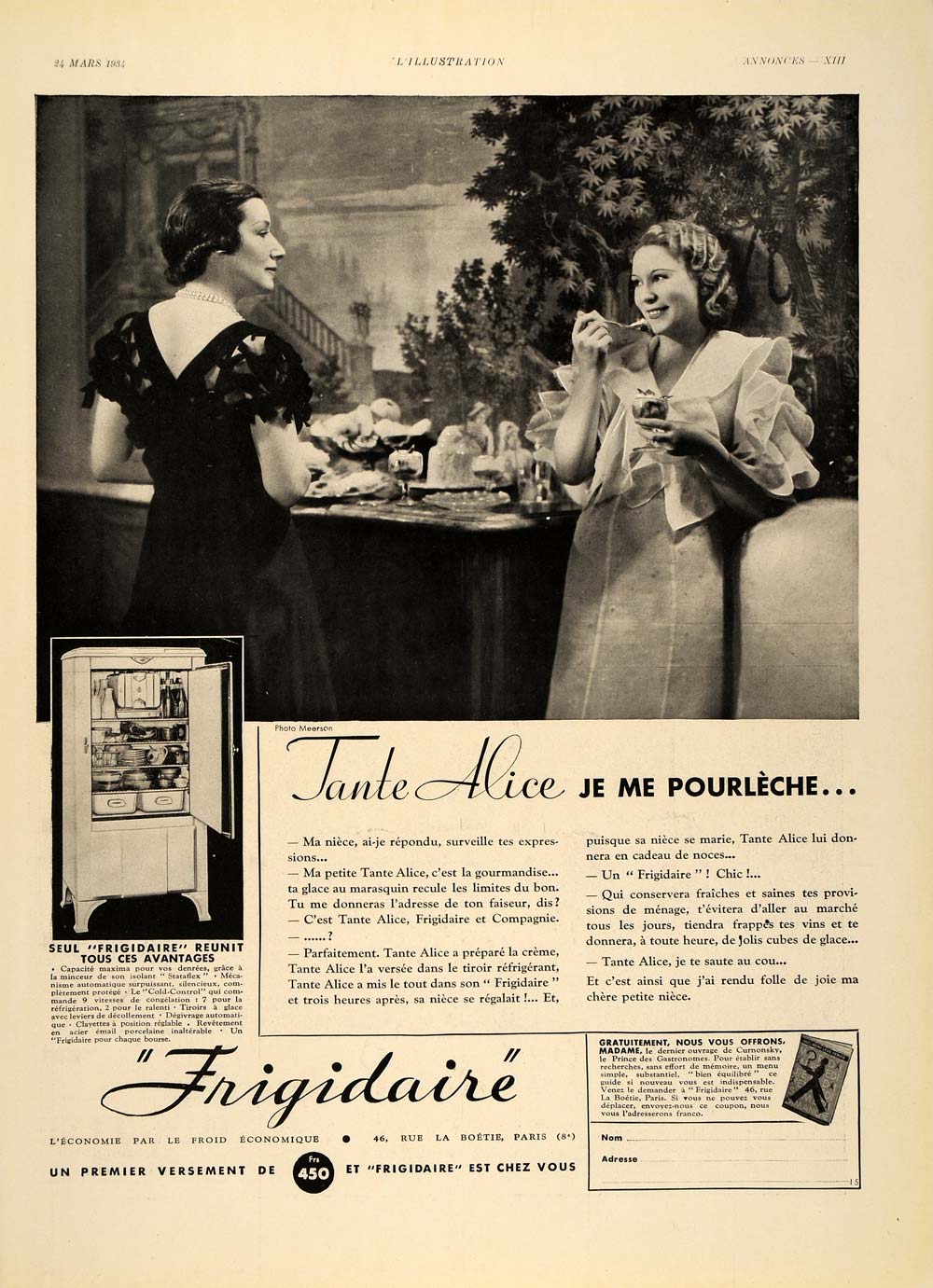 This is an original 1934 black and white French print ad for the Frigidaire Refrigerator.