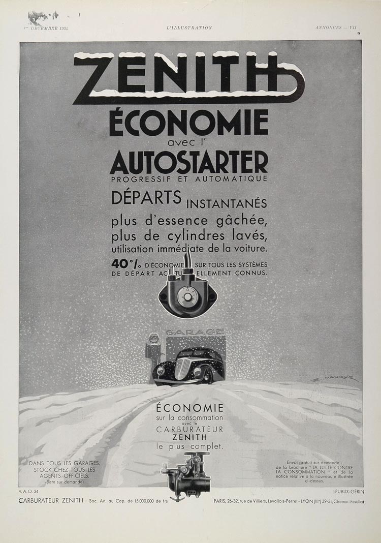 This is an original 1934 black and white French ad for Zenith carburetors.