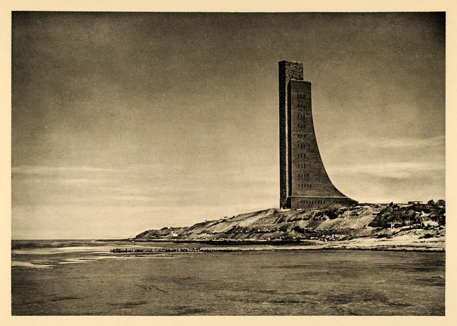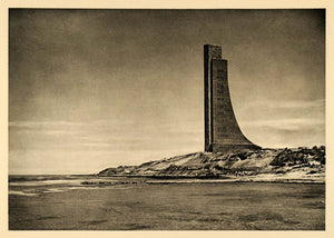This is an original 1934 photogravure of the Laboe Naval Monument near Kiel, Germany (Deutschland). The monument was completed in 1936, and commemorated the fallen German Navy personnel of World War I. While negotiations were being made after World War I, the admiral, Ludwig von Reuter, decided to scuttle, or sink, the entire German fleet in fear that it would otherwise be divvied up between the Allied powers. The photographer of this image is Ernst Scheel of Hamburg, Germany.