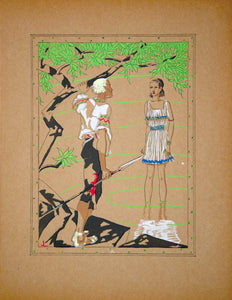 This is an original 1934 hand-colored pochoir print of an illustration by Logi Southby.