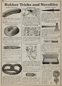 This is an original 1934 black and white print ad for various rubber trick and toy novelties including: a rubber hot dog, nail, dagger, doughnut, coat hanger, hatchet, squirt cigar, cigarettes, bowie knife, pretzels, squirt peanuts, and squawking toy, plus the extra long nose blower. A great print item for the collector of these vintage novelties or for the practical jokester in your family!