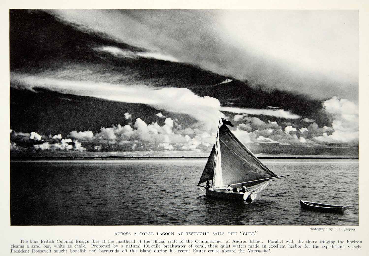 This is an original 1934 black and white halftone print of the British Colonial Ensign vessel, the "Gull" off the shore of Andros Island.