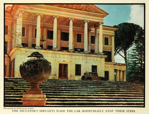 This is an original 1934 color print of Benito Mussolini's town house in Rome (Roma), Italy (Italia). Mussolini rented the home from Prince Torlonia. The caption writes, "The dictator's servants wash the car semipublicly atop these steps." Mussolini led the Italian National Fascist Party and was the Italian dictator from 1922 to 1943 going by various nicknames, including Capo del Governo, Duce del Fascimo, Caporale d'onore Della Milizia Fascista, primo Ministro del Regno D'Italia, Ministro Dell'Interno, Cavaliere Dell'Ordine Supremo Dell'Annunziata Santissima, and Cavaliere Dell'Ordine Dello Sprone D'oro. Photography by Scaioni.