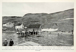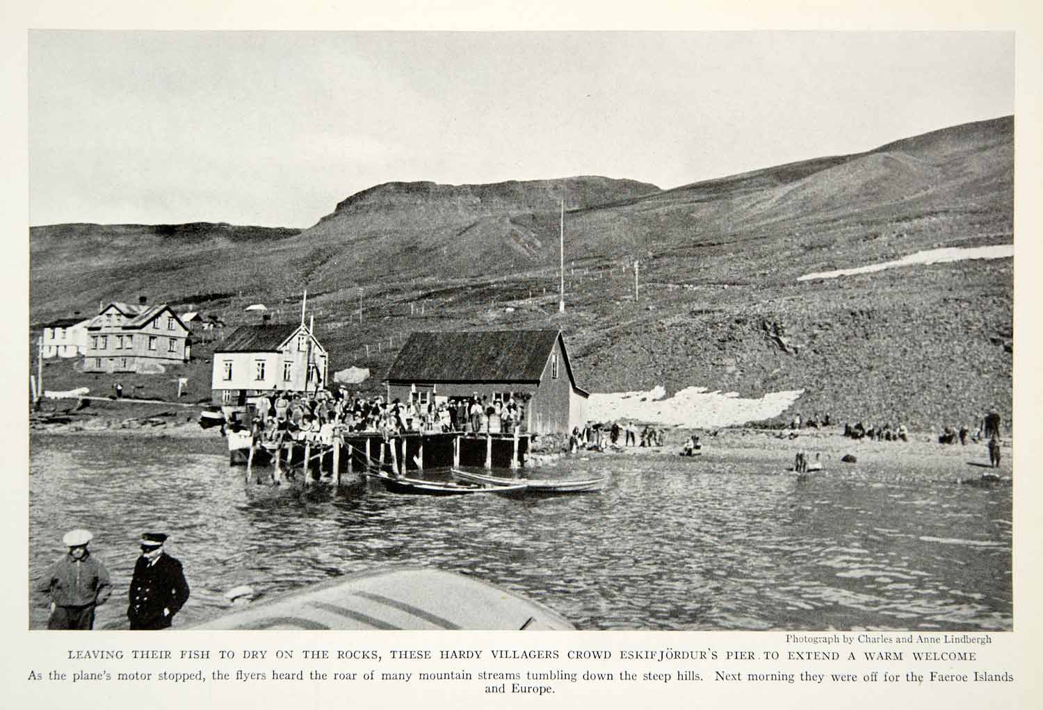 This is an original 1934 black and white halftone print of the shoreline and residents of the Icelandic town of Eskifjördur.