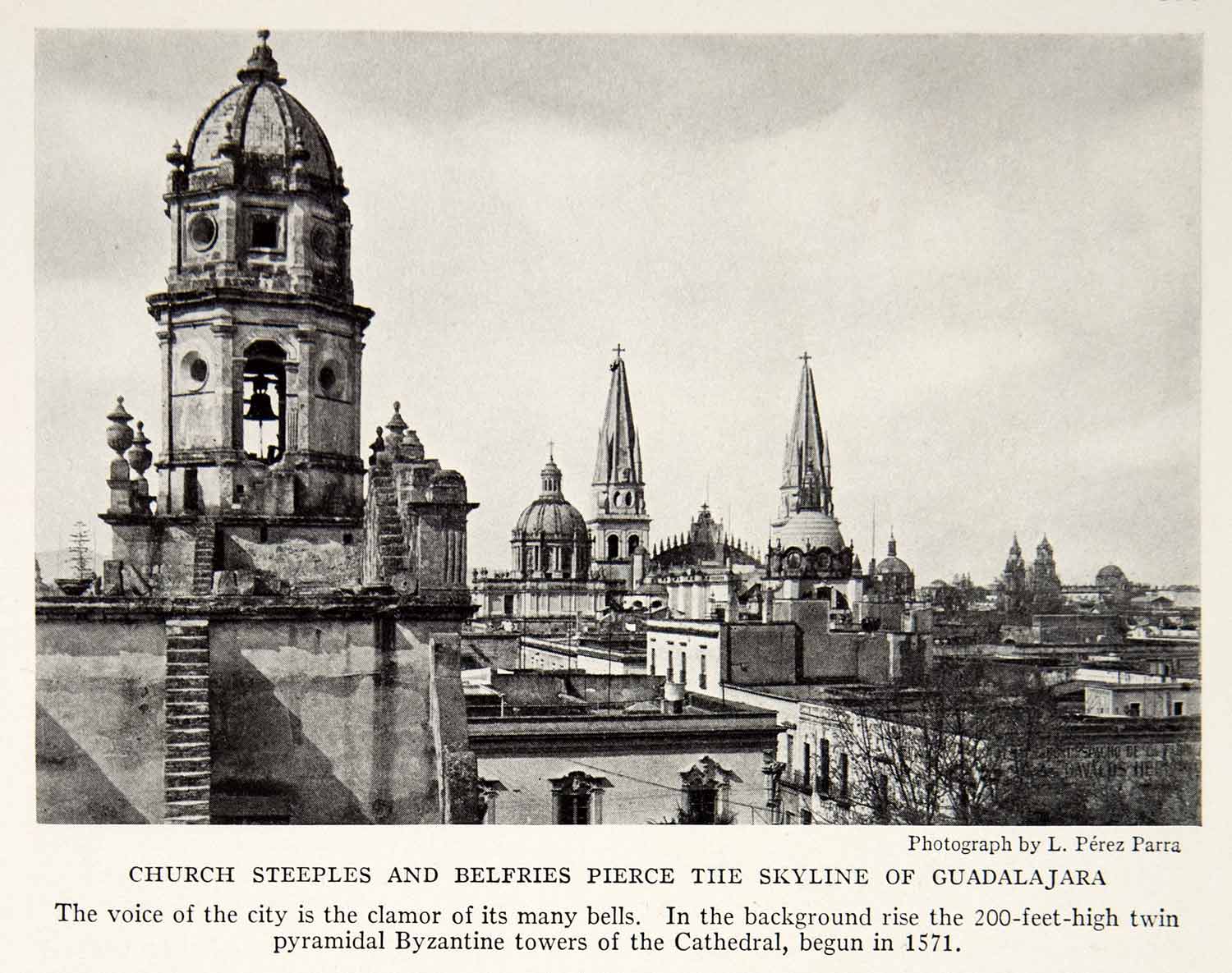 This is an original 1934 black and white halftone print of the cityscape of the Mexican city of Guadalajara.