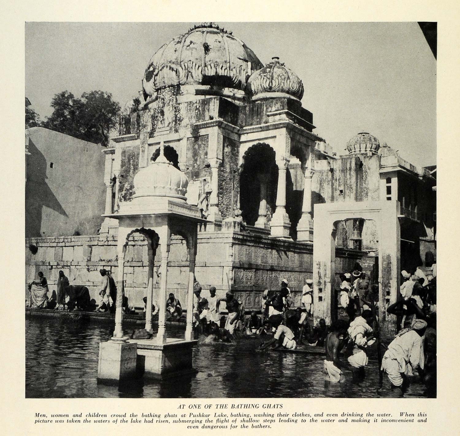 This is an excellent original 1934 halftone print of the Pushkar Lake, a sacred lake, located in the Pushkar town in Rajasthan, India. Rajputana is the historical name of the state Rajasthan. Thousands of pilgrims gather at the bathing ghats where the Pushkar fair takes place. The Pushkar Fair is an annual five-day livestock and camel fair which is celebrated with a camel race, music, sons and exhibitions.