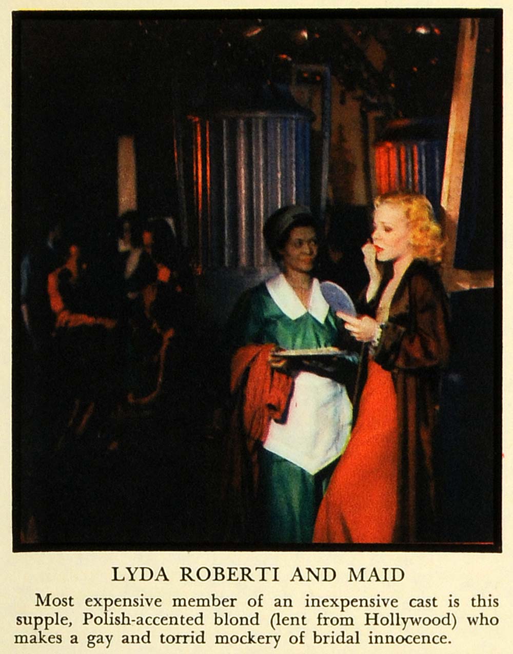 This is an original 1934 color print of Lyda Roberti and a maid. The caption writes, "Most expensive member of an inexpensive cast is this supple, Polish-accented blond (lent from Hollywood) who makes a gay and torrid mockery of bridal innocence."
