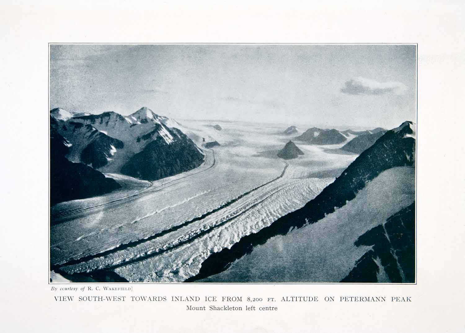 This is an original 1934 duotone halftone print of a "View Southwest Twoards Inland Ice from 8,200 feet Altitude on Petermann Peak; Mount Shackleton Left Center."
