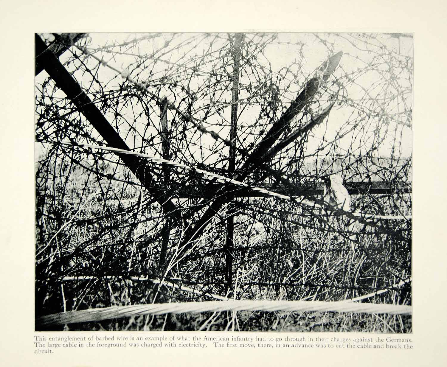This is an original 1934 black and white halftone print of a photograph of the typical barbed wire defenses bordering "no man's land" on the battlefields of the Western Front in Europe during World War I that American "doughboys" soldiers had to go through during their assaults against the German lines. As if these defenses weren't sadistic enough, it should be noted that the cable pictured in the foreground was also electrified.