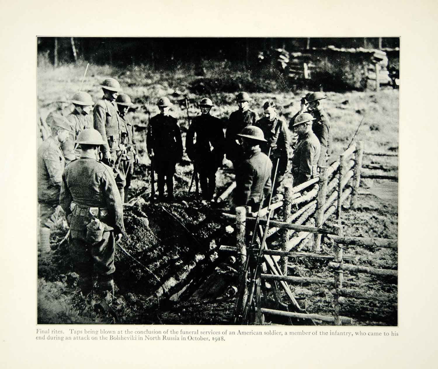 This is an original 1934 black and white halftone print of a photograph of an American military funeral that took place in North Russia during World War I.