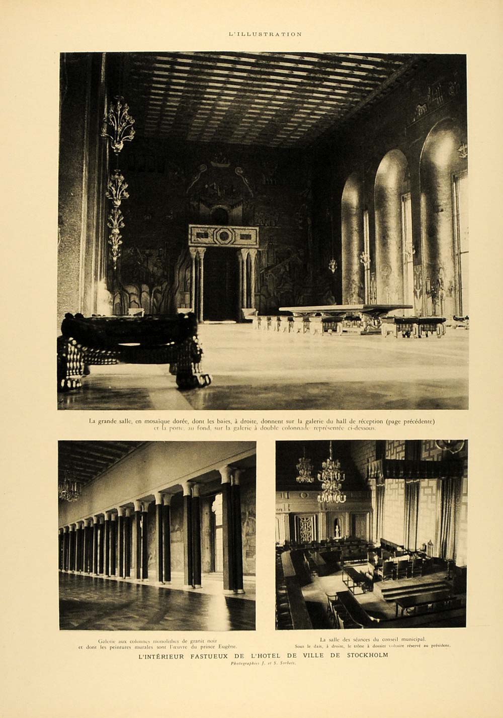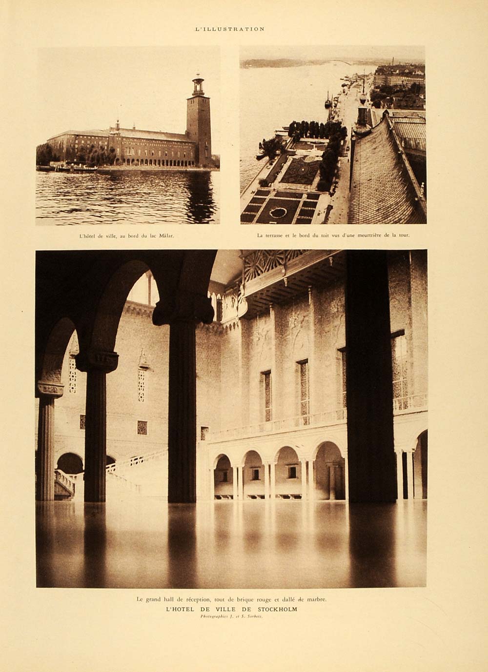 This is an original 1934 double-sided halftone print with views of the city hall building in Stockholm, Sweden. (Please see both images.)