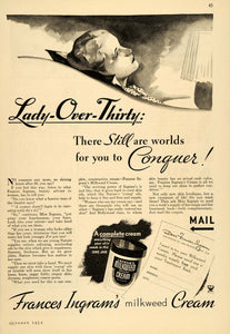 This is an original 1934 black and white print ad for Frances Ingram's Milkweed Cream.